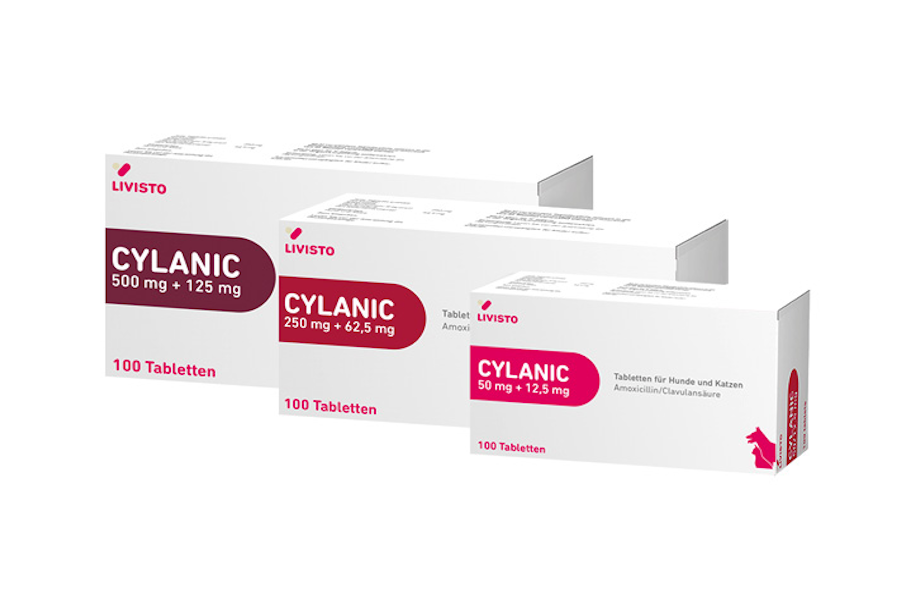 CYLANIC enthält die Wirkstoffe Amoxicillin und Clavulansäure und ist für die Behandlung von Infektionen verursacht durch Bakterien, welche gegenüber Amoxicillin und Clavulansäure empfindlich sind, zugelassen. Zu den Indikationen zählen Hauterkrankungen, Weichteilinfektionen, Zahninfektionen, Harnwegsinfektionen, Atemwegserkrankungen und Enteritiden. Perforierte Blister und durch Easy-Tab halbier- und viertelbare Tabletten ermöglichen eine passgenaue Dosierung für jedes Körpergewicht. Das hypoallergene Vanille-Aroma sorgt zusätzlich für eine gute Akzeptanz bei Hunden und Katzen. Cylanic ist erhältlich in den Stärken 50 mg/12,5 mg und 250 mg/62,5 mg für Katzen und Hunde und der Stärke 500 mg/125 mg für Hunde.