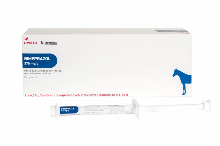 Bimeprazol enthält den Wirkstoff Omeprazol und ist für die Behandlung und Prävention von Magengeschwüren beim Pferd zugelassen. Die Paste ist für den Einsatz bei Fohlen, die älter als 4 Wochen und schwerer als 70 kg KGW sind, geeignet. Der Inhalt einer Spritze ist ausreichend für die Behandlung eines Pferdes von 575 kg Körpergewicht mit einer Dosis von 4 mg Omeprazol pro kg Körpergewicht. Bimeprazol ist die einzige Omeprazol-Paste für Pferde mit Apfelaroma. Eine Packungseinheit entspricht einer Kartonschachtel mit 7 Fertigspritzen à 6,16 g Paste.
