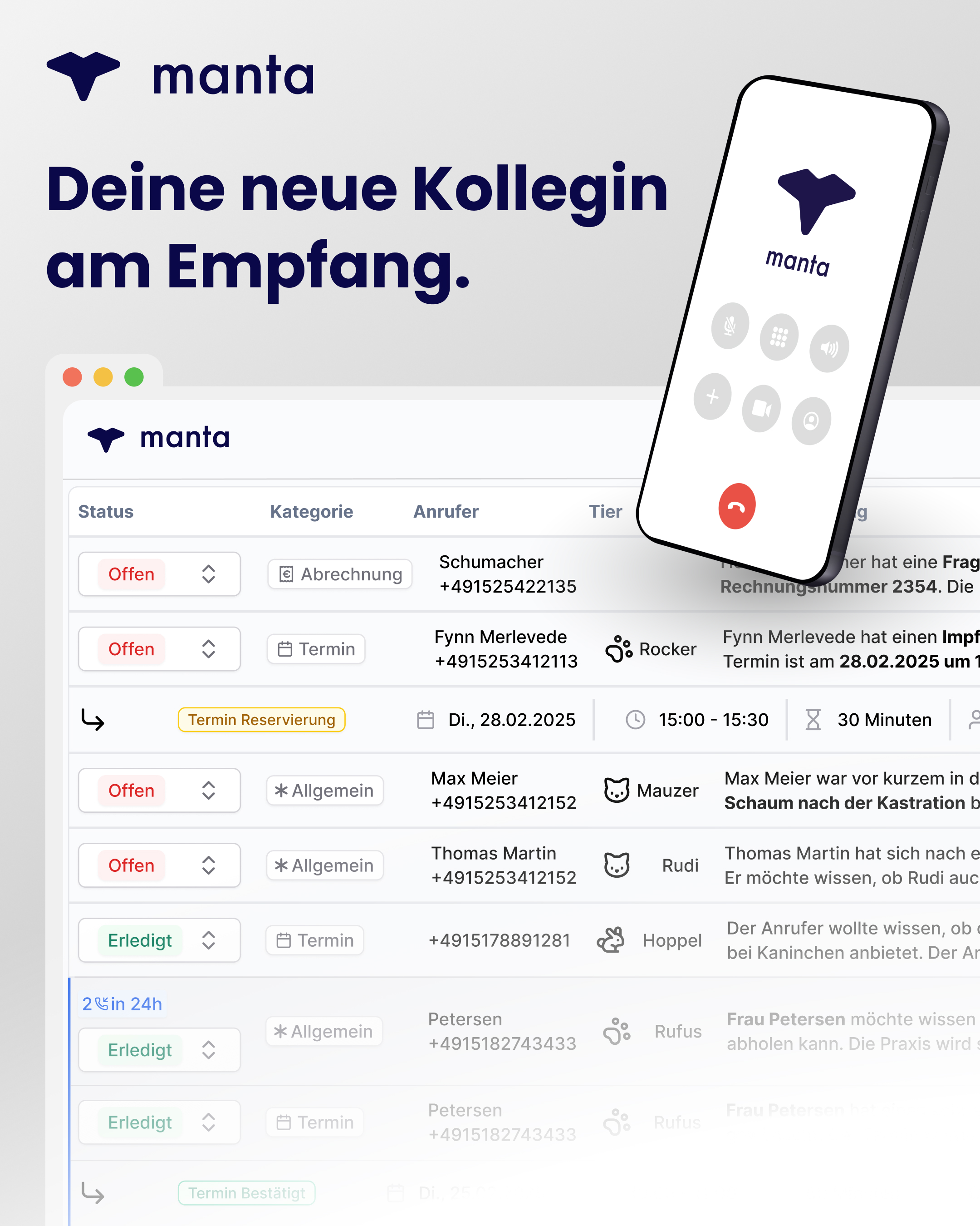 Several practices and clinics, such as Tierarztpraxis Launhardt or Kleintierklinik Frankenthal, are already using Manta successfully.